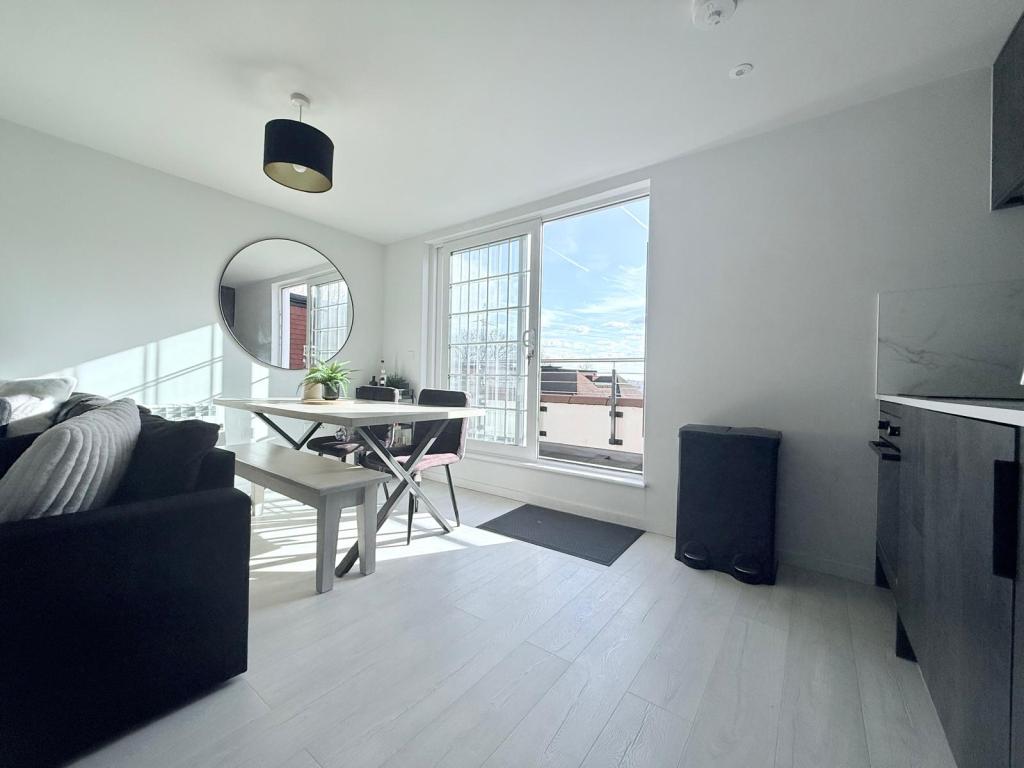The property boasts a contemporary open-plan lounge and kitchen area, featuring sleek fitted units, integrated appliances, and ample workspace. The living area is tastefully decorated and benefits from plenty of natural light, creating a comfortable yet modern environment perfect for both relaxing and entertaining.