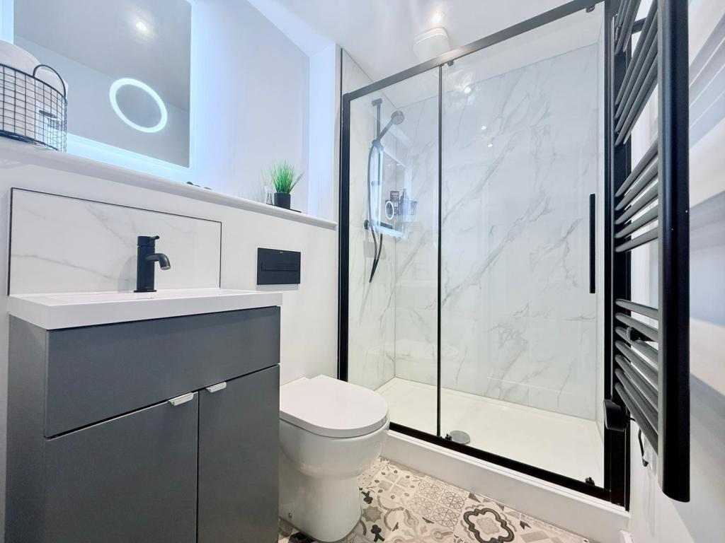 The double bedroom is generously sized and well-presented, complete with built-in mirrored wardrobes providing excellent storage. A modern shower room, finished with high-quality fittings, completes the accommodation.